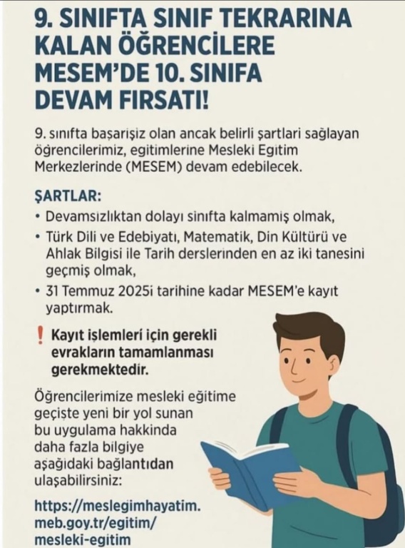 Derslerinden en az iki tanesinden geçen öğrenciler MESEM’ e geçip 10. Sınıftan eğitim öğretim hayatına devam edebilirler.