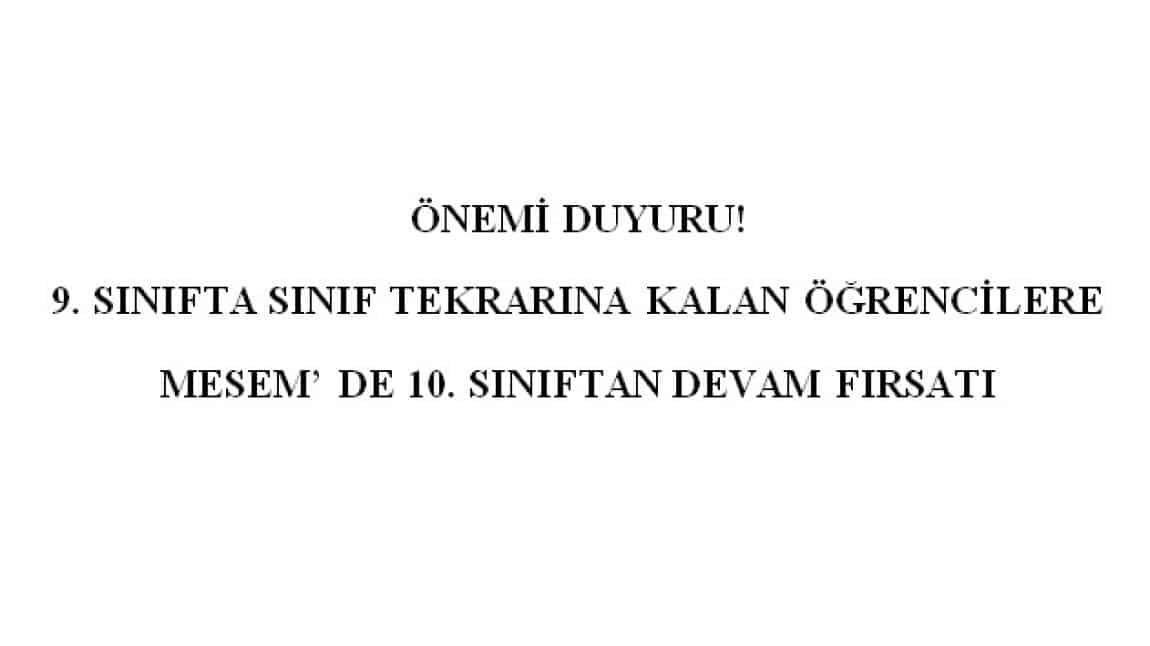 ÖNEMLİ DUYURU! 9. SINIFTA SINIF TEKRARI OLAN ÖĞRENCİLERİMİZİN DİKKATİNE! (Mesem programına 10.sınıftan devam edebilme fırsatı)